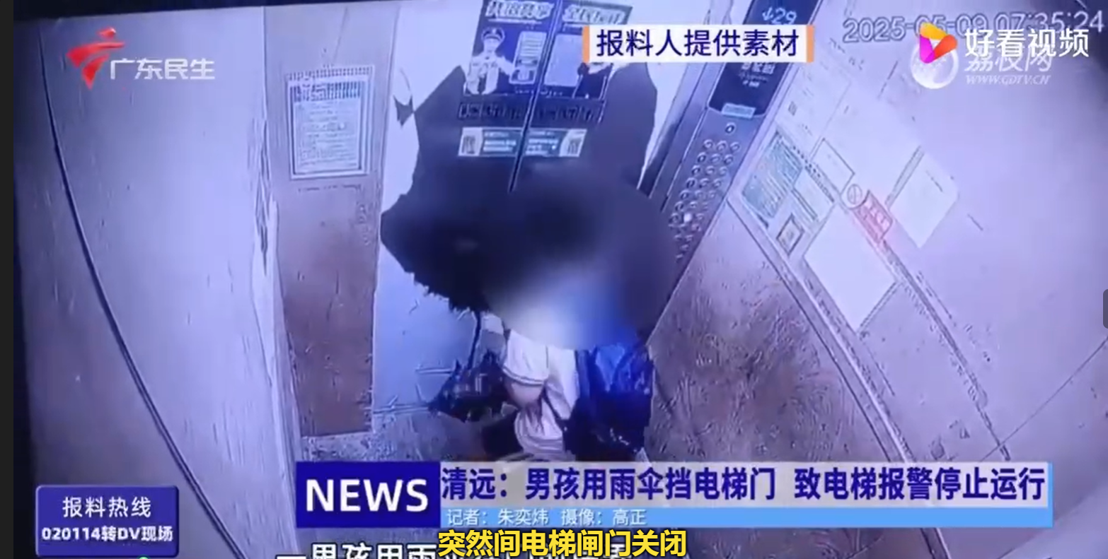 5月9日,广东清远某小区发生一起电梯安全事件。一名男孩在乘坐电梯时,出于好奇或不当操作,竟手持雨伞阻挡电梯门关闭。雨伞不慎卡入轿厢顶部缝隙,触发电梯安全保护装置,导致电梯报警并停止运行。